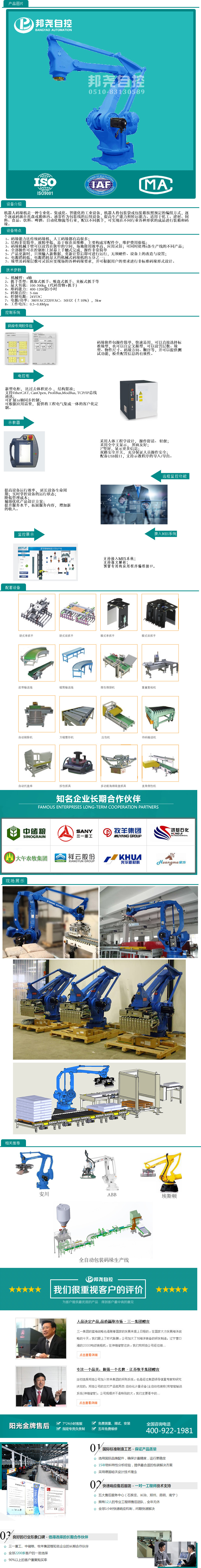 无锡邦尧自控技术有限公司15年来一直专注于物料的自动称重和输送工程,产品横跨饲料,面粉,肥料,精细化工和建筑材料等行业,针对这些行业要求自动码垛速度快(码垛速度最快要求达到1200包/时),现场粉尘大,要求售后服务反应迅速这些特点,与安川机器人达成战略合作伙伴关系,针对袋装物料自动码垛这个细分市场,做了详细的产品细节改进和技术分析,专一为用户提供物料从自动称重,整形,金属检测,复检称,自动喷码,自动码垛到缠绕膜包装这一站式解决方案.