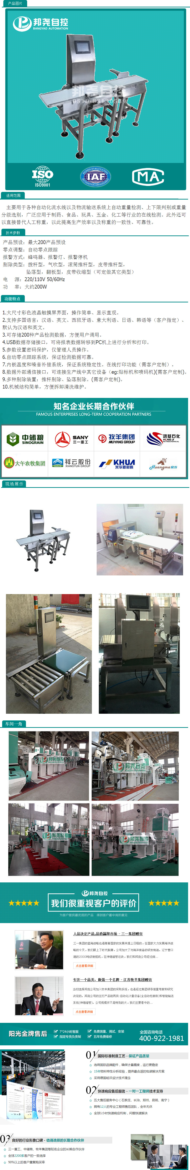 重量选别机又叫重量分选机,在线检重秤,是一种应用于各种自动化流水线以及物流输送系统上的自动重量检测、上下限判别或根据重量检测产品是否合格的高科技自动化分选设备。广泛应用于制药、食品、玩具、五金、化工、汽车配件等行业的在线检测。此外,还可直接替代人工称重,以达到提高生产效率,提高准确度和山少人工,降低成本的目的。