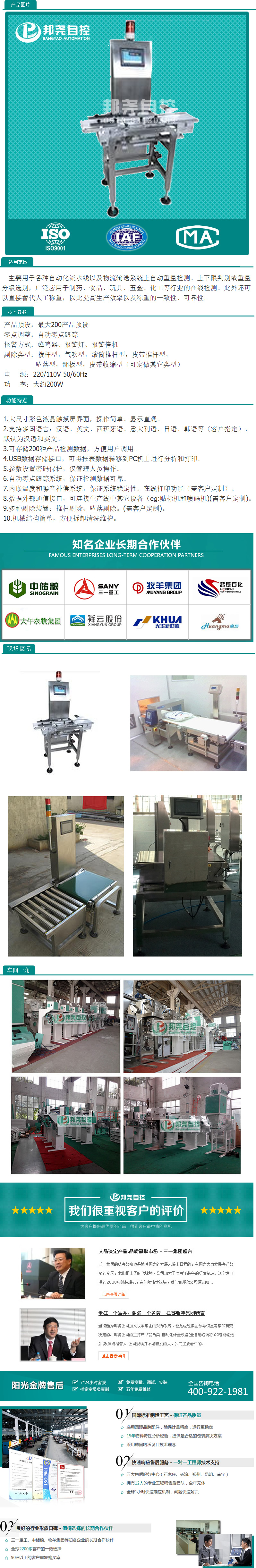 重量选别机又叫重量分选机,在线检重秤,是一种应用于各种自动化流水线以及物流输送系统上的自动重量检测、上下限判别或根据重量检测产品是否合格的高科技自动化分选设备。广泛应用于制药、食品、玩具、五金、化工、汽车配件等行业的在线检测。此外,还可直接替代人工称重,以达到提高生产效率,提高准确度和山少人工,降低成本的目的。