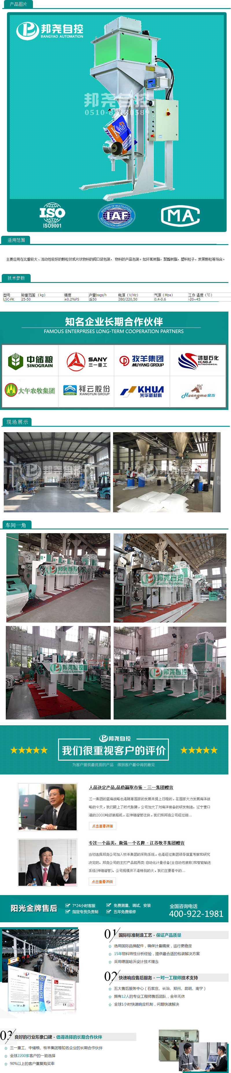 主要应用在比重较大、流动性较好的颗粒状或片状物料的阀口袋包装, 物料的产品包装。如环氧树脂,聚酯树脂,塑料粒子,炭黑颗粒等场合。